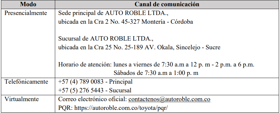 En desarrollo de sus competencias, recolecta información de distinto orden a través de todos sus canales oficiales de atención (escrito, presencial, telefónico y virtual), durante las 24 horas del día, los 7 días de la semana de lunes a domingo incluido los días festivos, garantizando la atención de conformidad con la demanda. Así mismo, recolecta información a través de programas y/o campañas comerciales dirigidas a los clientes, datos de Página 11 de 18 los empleados y colaboradores AUTO ROBLE LTDA., así como de proveedores, aliados estratégicos, contratistas, entre otros.