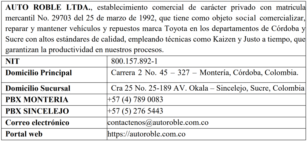 Teniendo en cuenta que la misión AUTO ROBLE LTDA. es comercializar, reparar y mantener vehículos y repuestos marca Toyota en los departamentos de Córdoba y Sucre con altos estándares de calidad, empleando la filosofía Kaizen y la política Justo a tiempo para todos sus clientes, a fin de garantizar la productividad y cumplimiento en sus procesos, lo hace responsable del tratamiento de datos personales obtenidos en desarrollo de su objeto social y funciones comerciales.